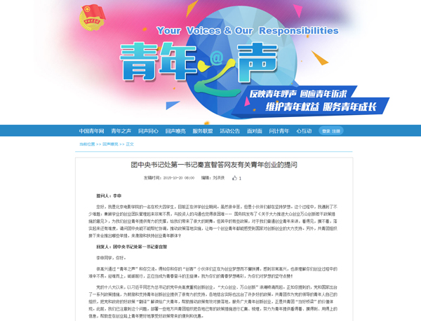 10月20日,團中央書記處第一書記秦宜智通過“青年之聲”互動社交平臺回答網(wǎng)友提問。網(wǎng)頁截圖 中國青年網(wǎng)北京10月20日電(記者 劉妍彤) “我為你們的青春夢想喝彩